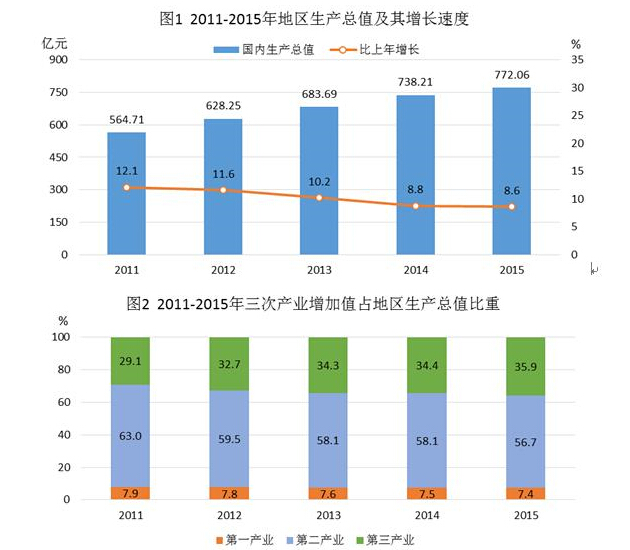 初步核算,全年实现地区生产总值772.06亿元,比上年增长8.6%。其中,第一产业增加值57.22亿元,增长3.6%;第二产业增加值437.58亿元,增长8.9%;第三产业增加值277.25亿元,增长8.8%。第一产业增加值占地区生产总值的比重为7.4%,第二产业增加值占比为56.7%,第三产业增加值占比为35.9%。非公有制经济增加值433.90亿元,比上年增长8.9%,占地区生产总值比重56.2%。