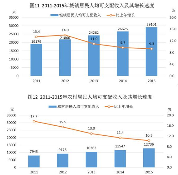 全年城镇居民人均可支配收入29101元,比上年增长9.3%;农村居民人均可支配收入12736元,增长10.3%。城镇居民人均消费支出18198元,增长8.4%;农村居民人均消费支出9508元,增长14.8%。