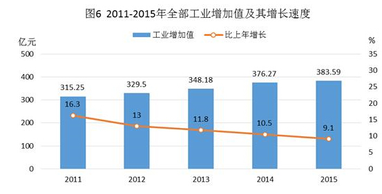 全年全部工业增加值383.59亿元,比上年增长9.1%。规模以上工业增加值271.02(不含军工涉密企业)亿元,增长9.4%。在规模以上工业中,分经济类型看,国有控股企业下降3.8%,集体企业增长1.8%,股份制企业增长9.4%,外商及港澳台商投资企业增长 12.9%,私营企业增长5.8%。