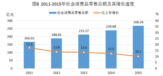 全年社会消费品零售总额268.26亿元,比上年增长10.2%。按经营地统计,城镇消费品零售额235.74亿元,增长10.3%;乡村消费品零售额32.52亿元,增长9.7%。