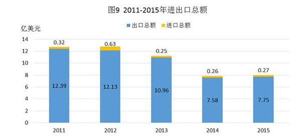 全年货物进出口总额8.02亿美元,比上年增长2.3%。其中,出口7.75亿美元,增长2.2%;进口0.27亿美元,增长5.3%。进出口差额(出口减进口)7.48亿美元。生产型出口总额 5.76亿美元,下降18.0%。